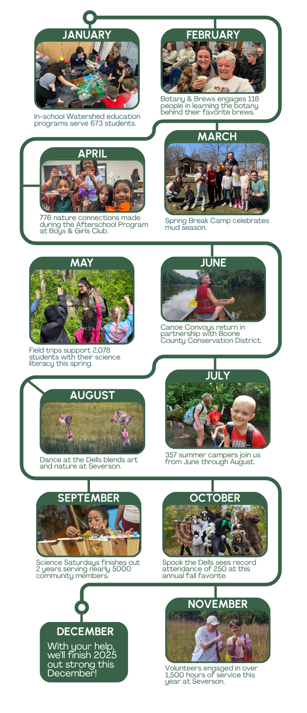 2025 has been full of moments that remind us why our work matters- highlighted in the timeline around this letter. Thanks to you and the generous community that joins you in supporting Severson Dells :