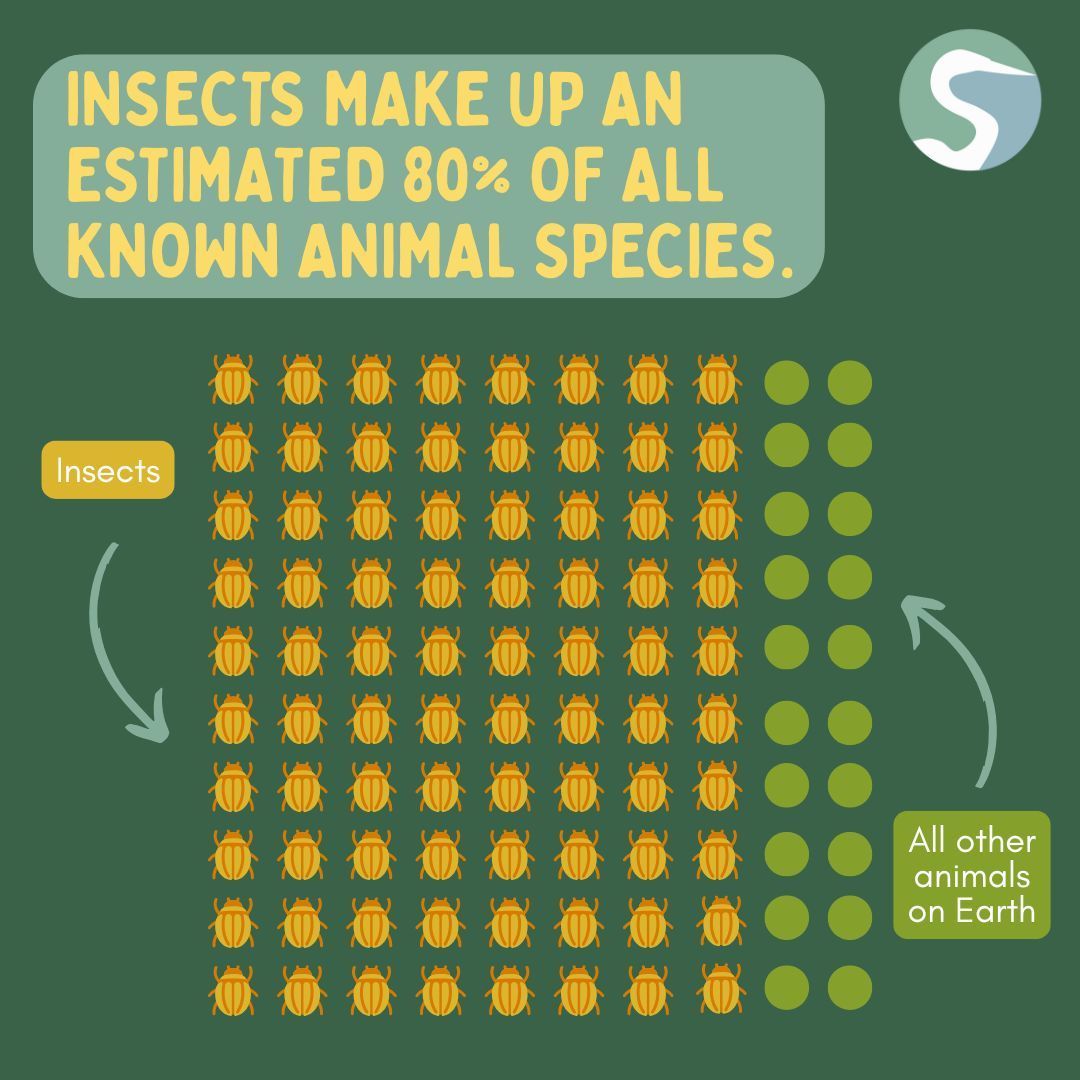 Insects make up an estimated 80% of all known animal species. Scientists have described around 1 million insect species so far, but the true number is likely closer to 5 million or more. Globally, it’s estimated that there are around