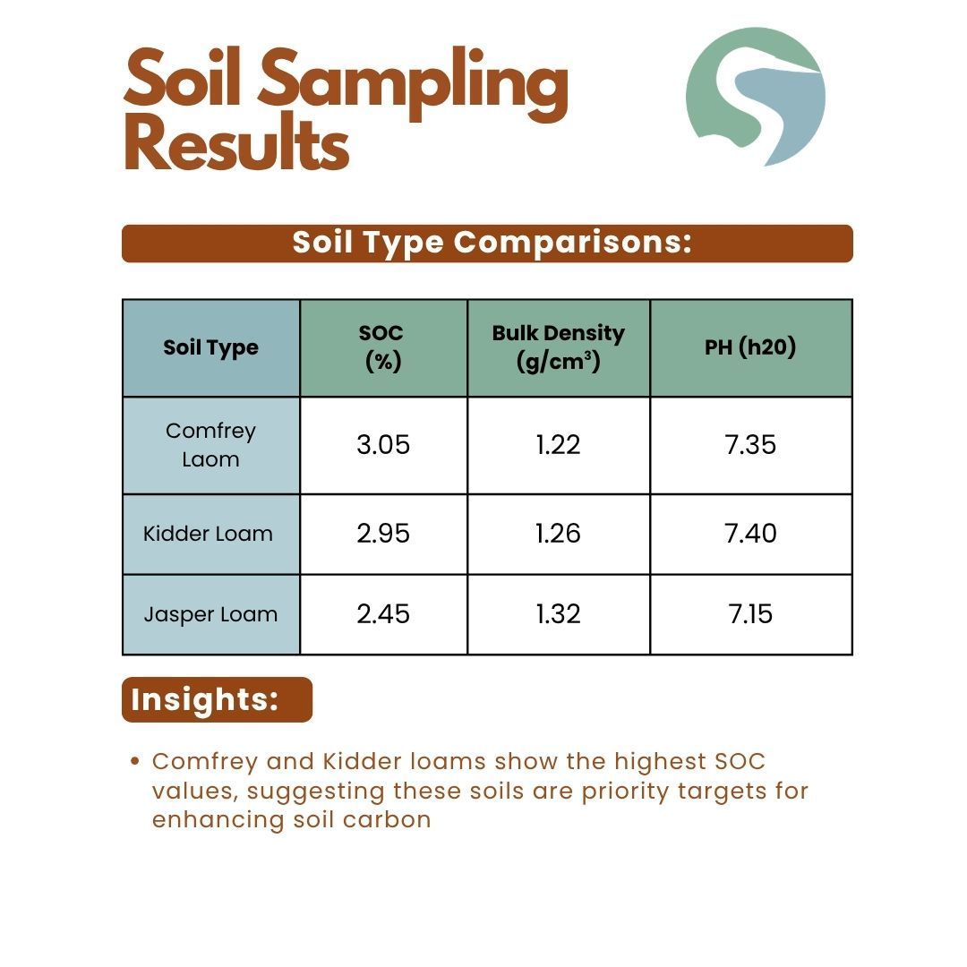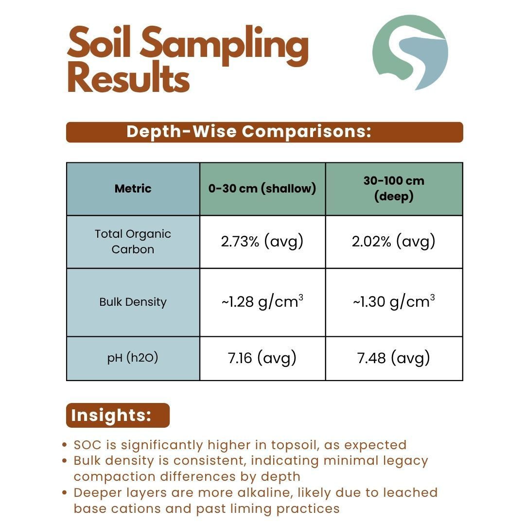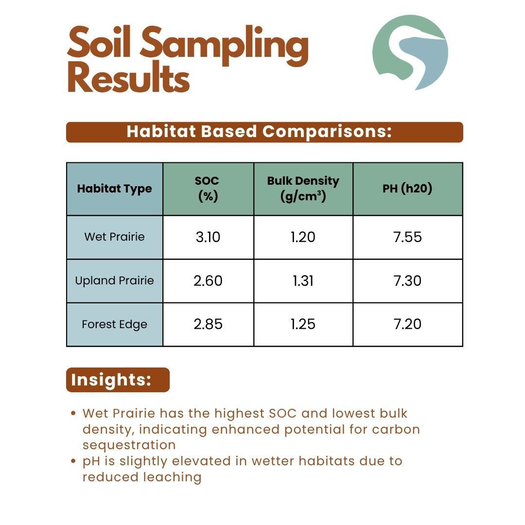 However, when native prairies are removed or degraded, that long-built carbon can be lost over time. Restoring prairies and other native habitats helps reverse this trend by rebuilding soil organic matter, capturing carbon, and supporting healthier ecosystems. Even though SOC levels at Prairie’s Edge are relatively high, there is still significant potential to restore the land closer to its original capacity.