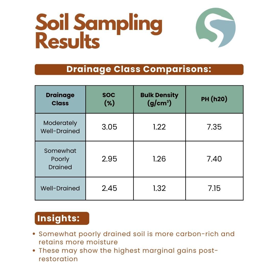 - Soil organic carbon (SOC) is where we expect to see some of the most meaningful gains. With active restoration, such as planting native species and improving water management, SOC levels in the topsoil could increase by about 0.2–0.4% per year. Over three years, this could translate to roughly 1.2 tons of carbon stored per hectare each year, which aligns with estimates from similar Midwestern restoration efforts.