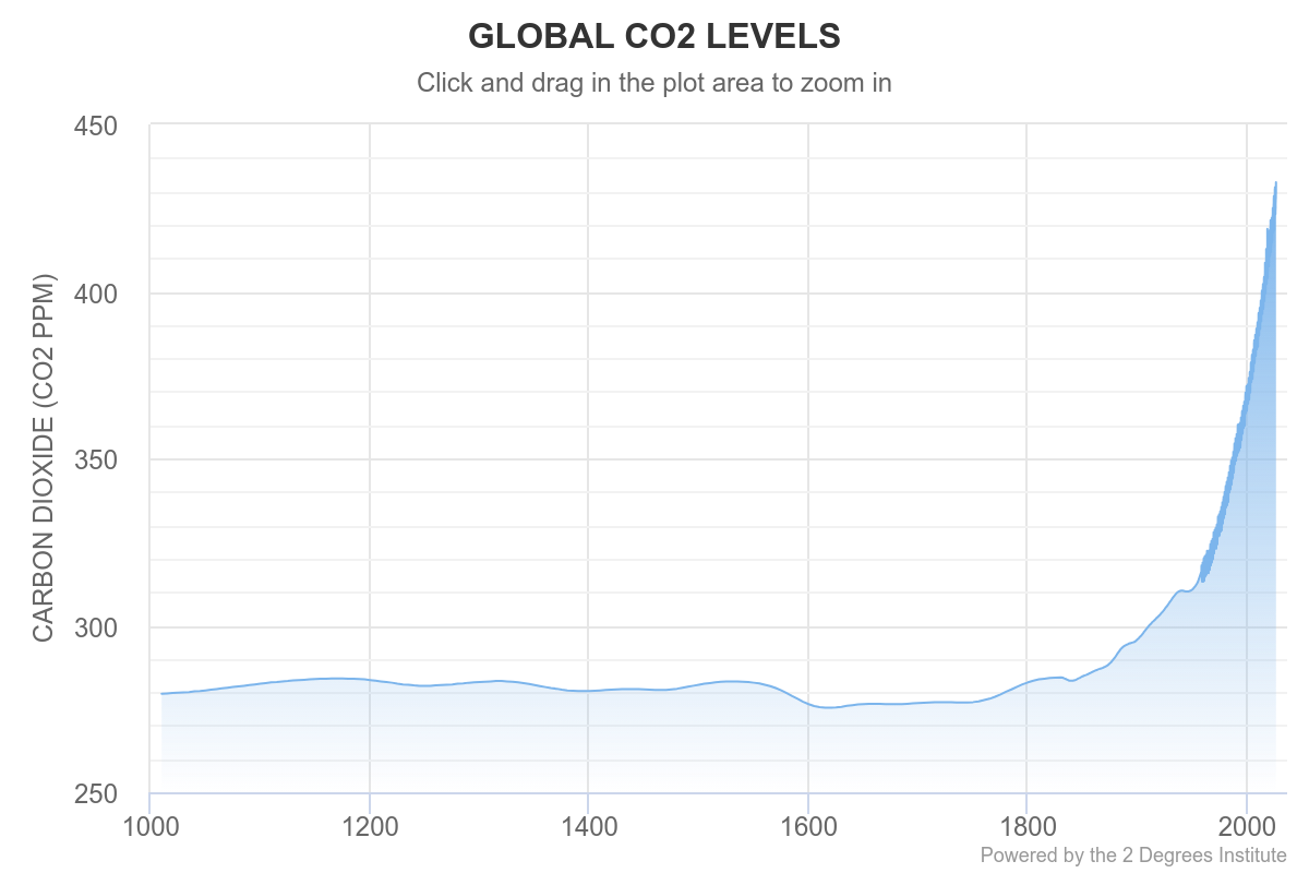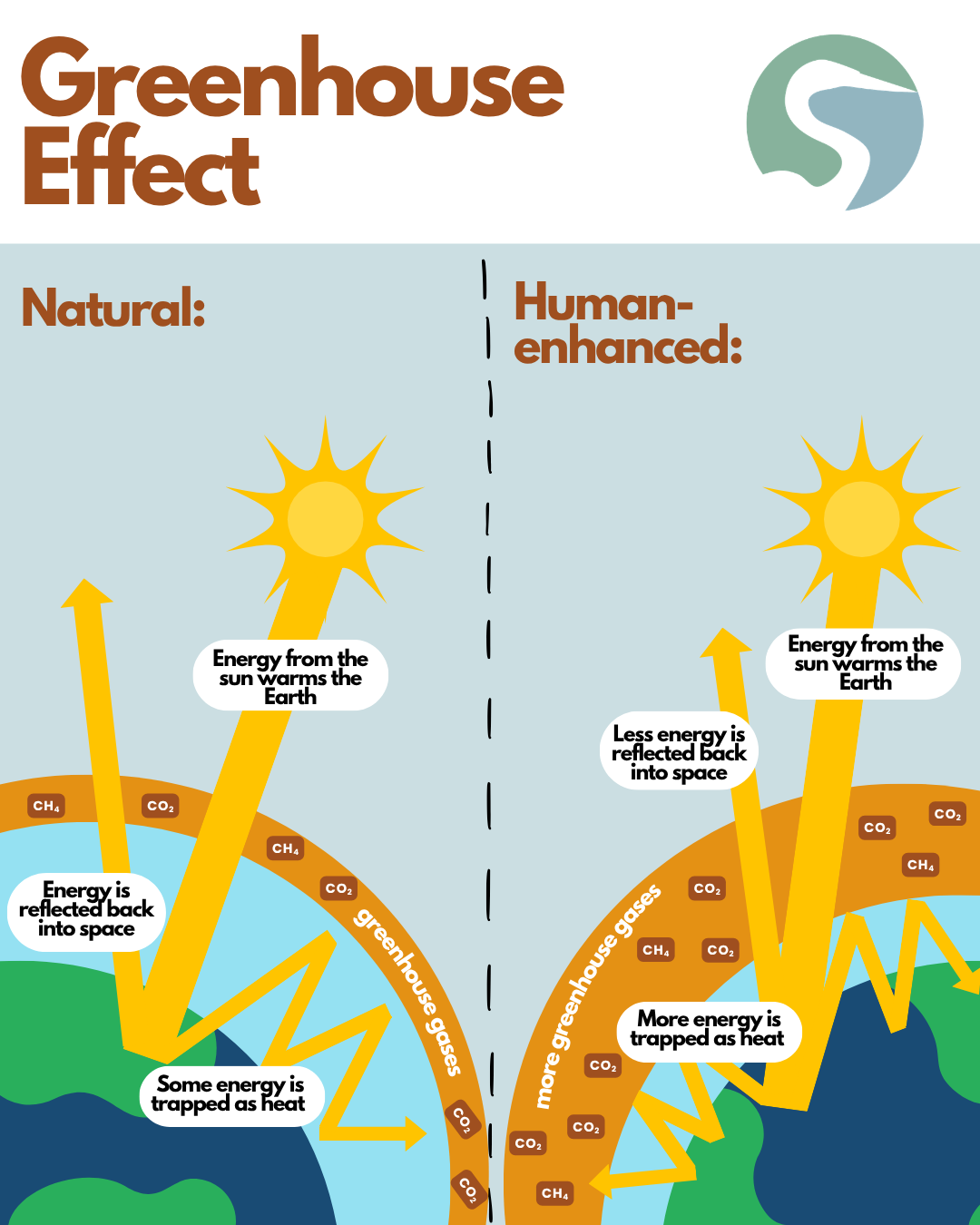 When we burn fossil fuels or alter the landscape, we release large amounts of stored carbon back into the atmosphere in a relatively short amount of time. Because this amount of carbon is more than natural systems can absorb it, carbon dioxide levels in the atmosphere have risen rapidly. Today, atmospheric carbon dioxide (CO2) is higher than it has been in the last 3.6 million years. This matters because carbon dioxide is a greenhouse gas, meaning it traps heat in the Earth’s atmosphere. As more of it accumulates, more heat is retained, and this is referred to as the greenhouse effect. The greenhouse effect, ultimately, drives the process we know as global warming.