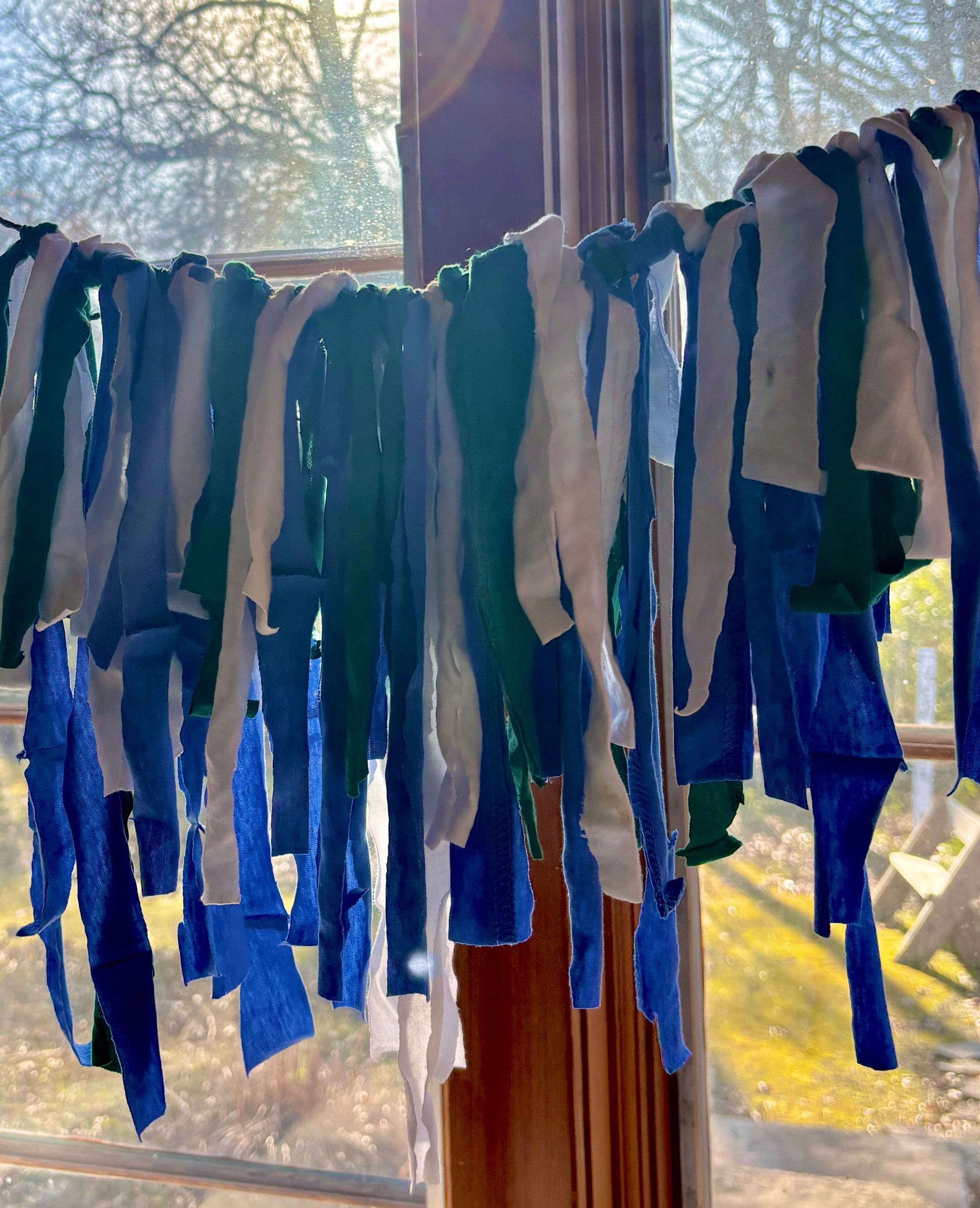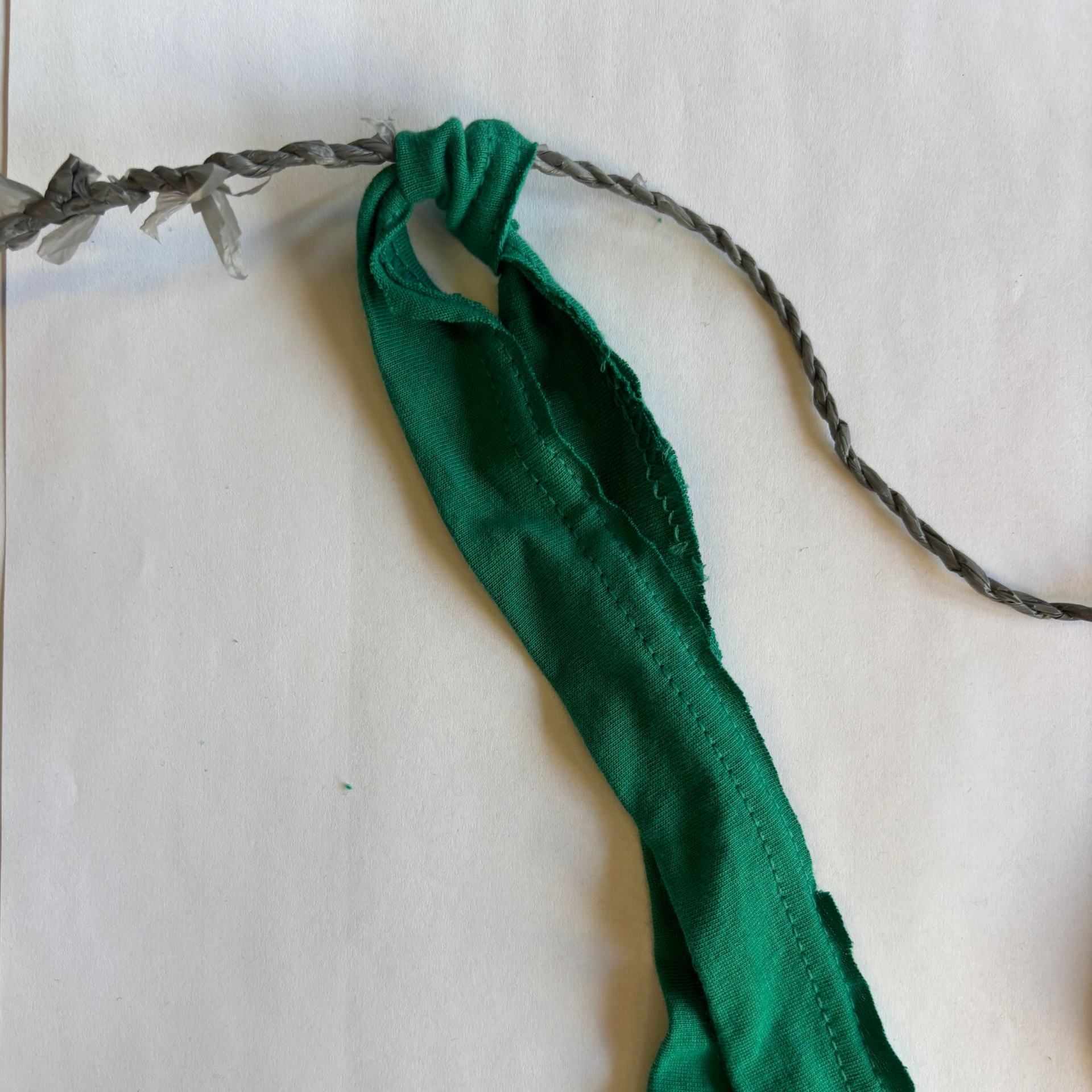 raffia cord, and then, using fabric strips cut from old t-shirts(you could use any unused textile or fabric item that is able to be cut into strips) turned into a colorful and textured holiday garland.