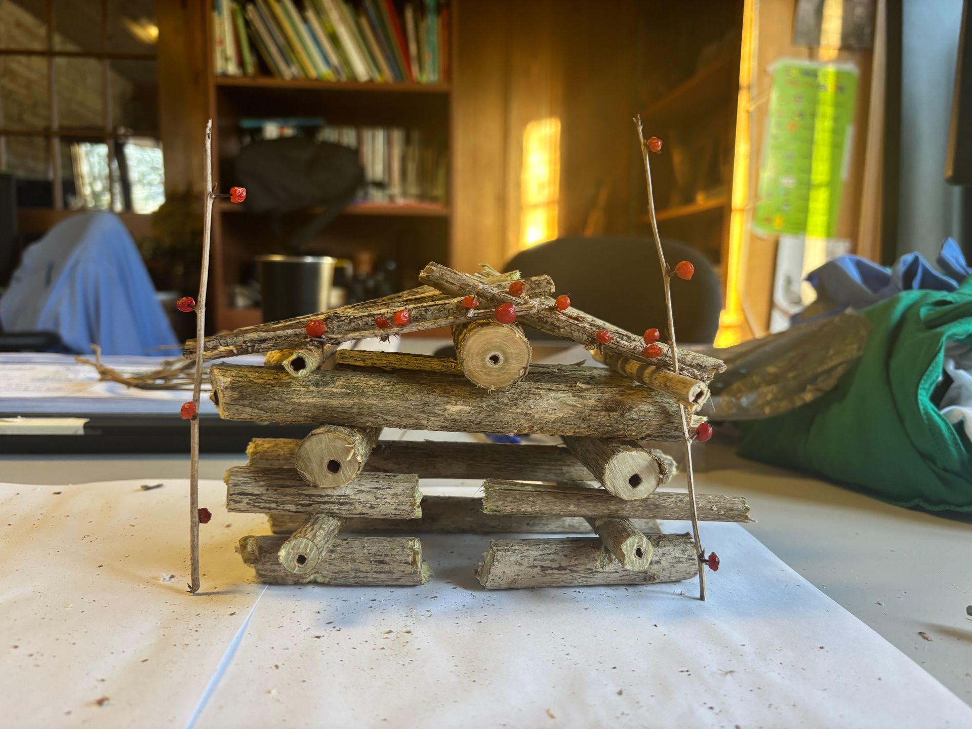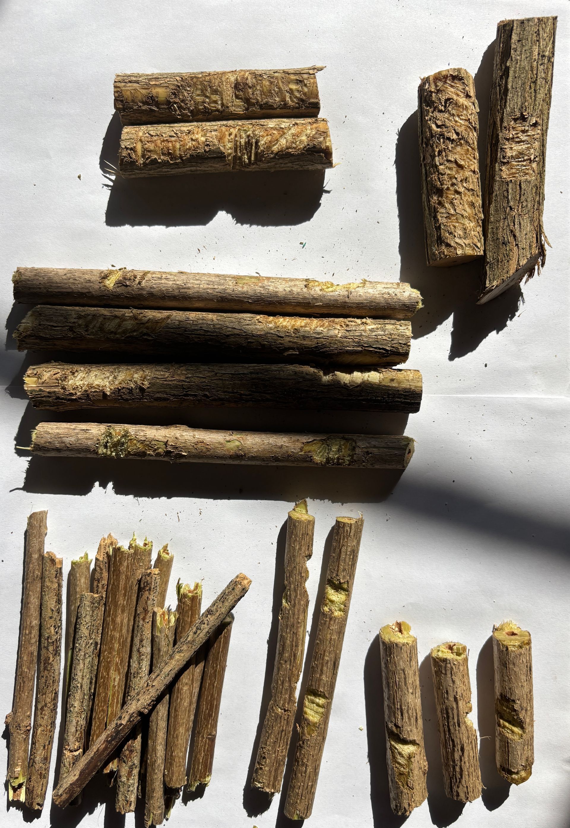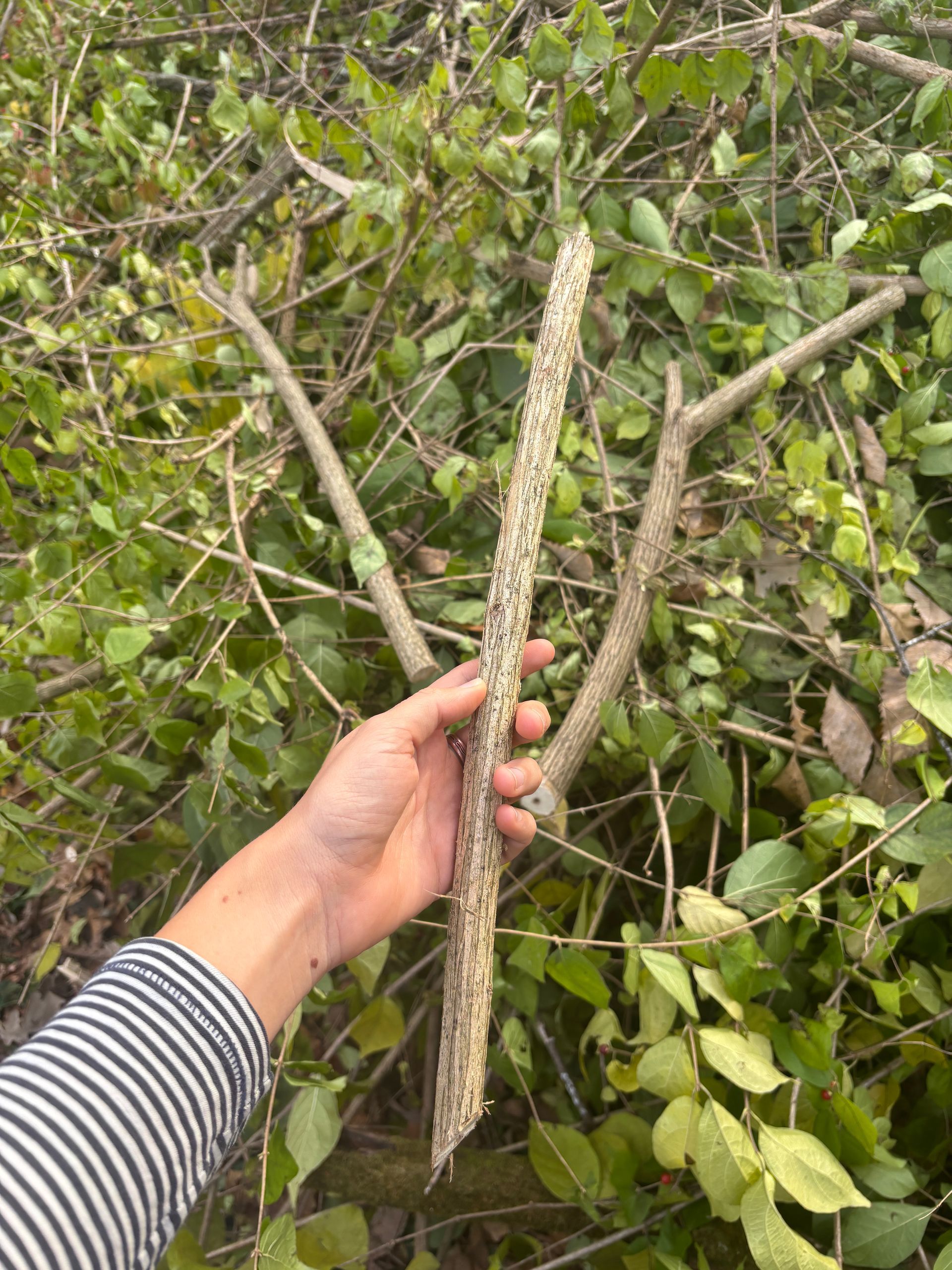 Once cut down, it's best to burn up the cuttings that fall so that no part of it (especially those bright red berries) spread around the forest. When you cut it, in tandem with burning, honeysuckle’s beautiful and pliable stems and branches can also be used to create holiday decor. One idea is to turn some of the mid-width stems into an adorable holiday house, making essentially simple stacking “logs”. All of this wood was cut and shaped using a handsaw you could find at your local hardware store. Although it may not need it, to make an easy and affordable glue for the pieces that could be burned with the house if it ever becomes unwanted, you can simply combine a little wheat flour and water in a bowl, and put it where the logs nest into each other.