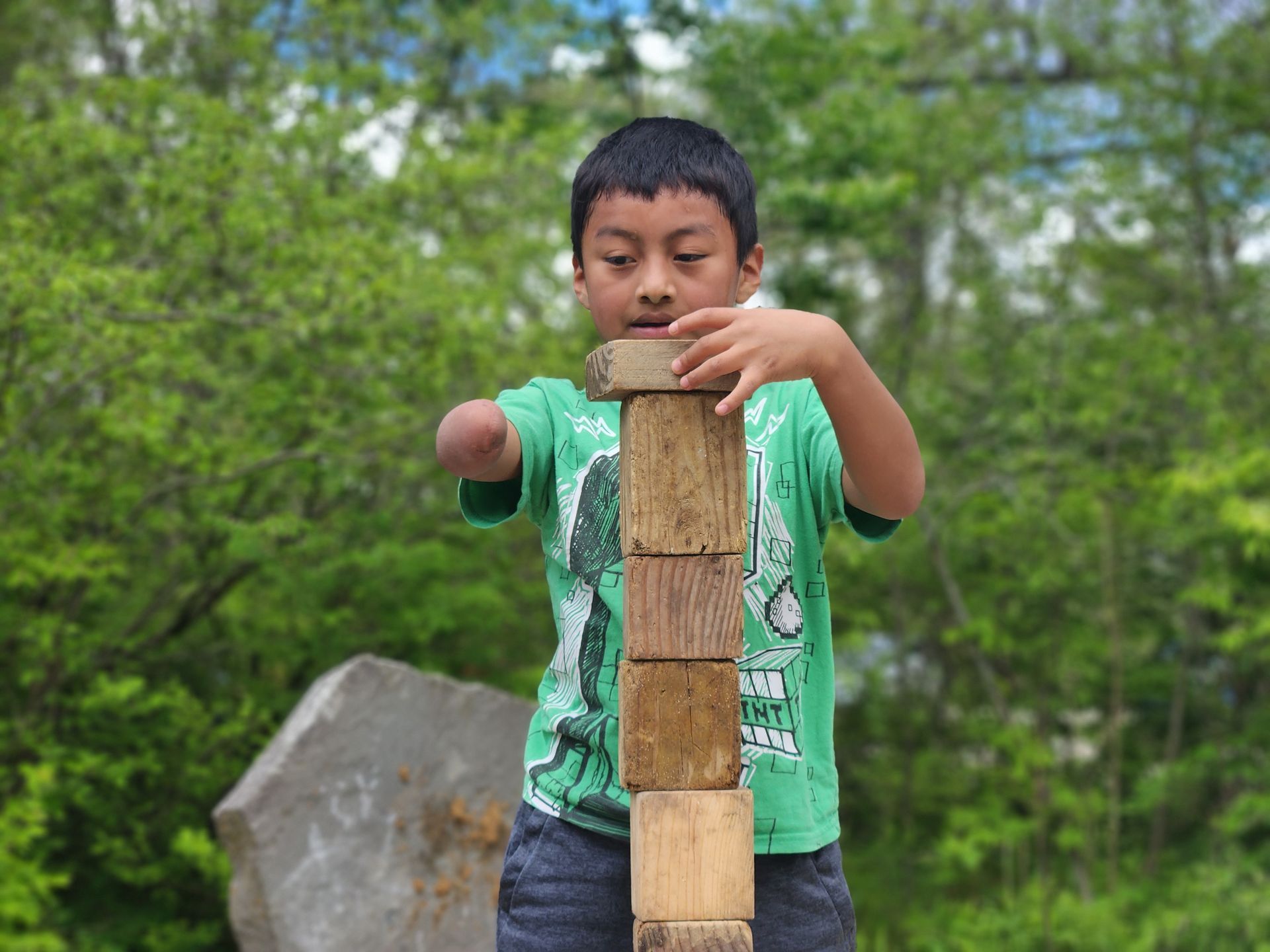 There is a block lab with wooden blocks and tree cookies that children use to build, stack, and create. A covered shack allows children to hang out, play house, school, or store, and display treasures on the shelves inside. Kids can paint with water from the rain barrel just outside the shack or play on the sand table. And there are logs that children can climb on, rearrange, and use to make up whatever adventure stories they want.
