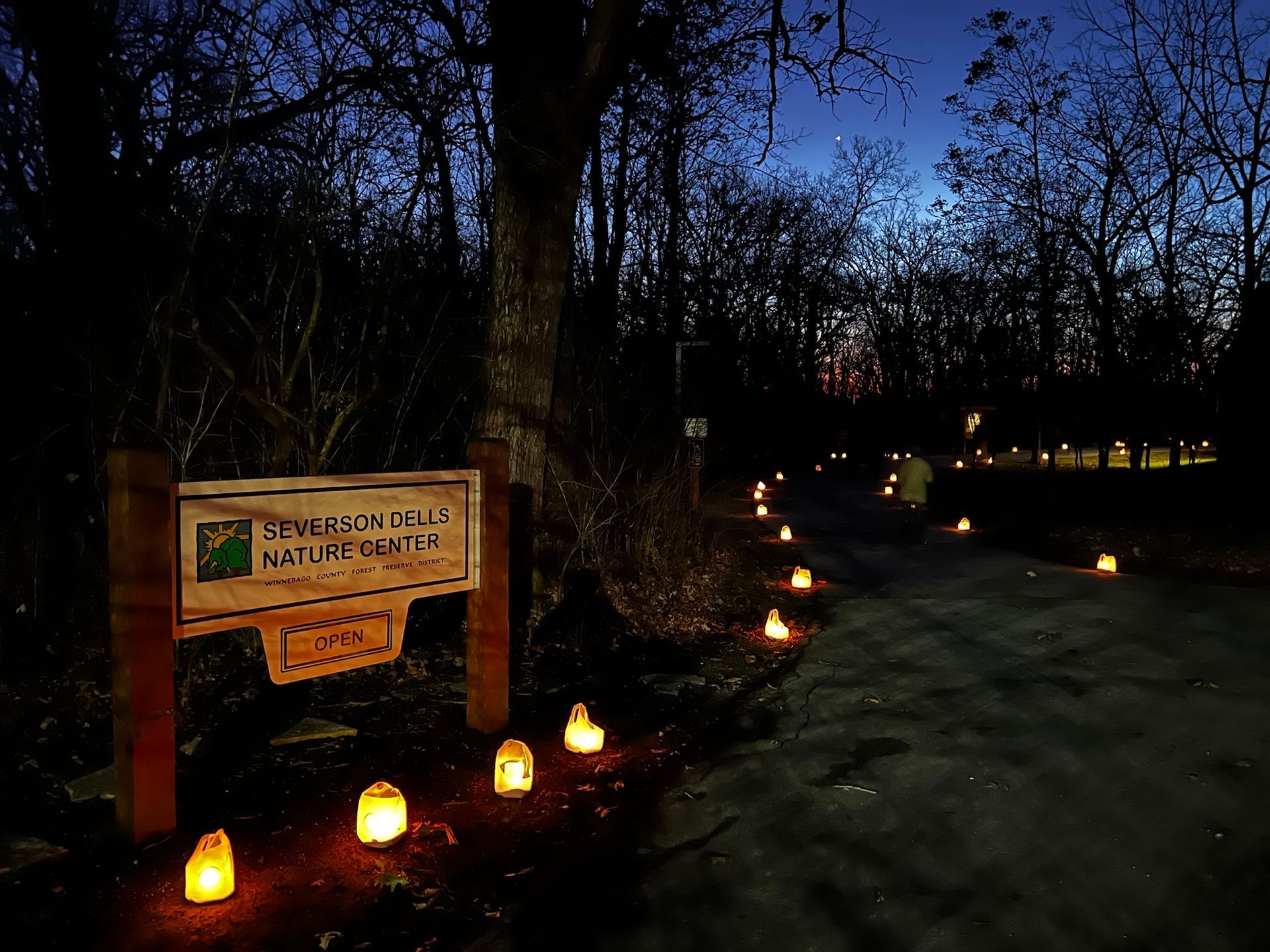 Welcome to an enchanting evening at Severson Dells, where our paths come alive with the soft glow of Luminaria lights.